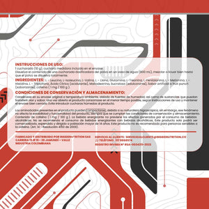 Alimento que contiene fruta deshidratada en polvo, aminoácidos (Glutamina, L-Leucina, L-Lisina, L-Fenilalanina, L-Arginina, L-Valina, L-Treonina, L-Isoleucina, L-Metionina, L-Triptófano, L-Histidina, L-Teanina), entre otros ingredientes.
