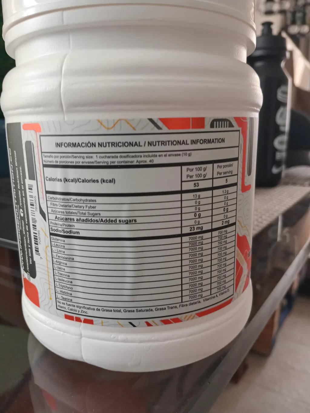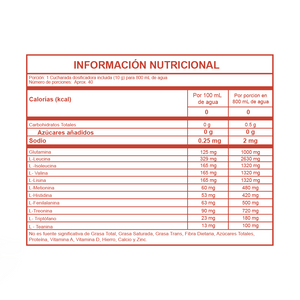 AMINO BLEND, es un alimento que contiene fruta deshidratada en polvo, mezcla de aminoácidos (Glutamina, L-Leucina, L-Lisina, L-Fenilalanina, L-Arginina, L-Valina, L-Treonina, L-Isoleucina, L-Metionina, L-Triptófano, L-Histidina, L-Teanina), entre otros ingredientes.