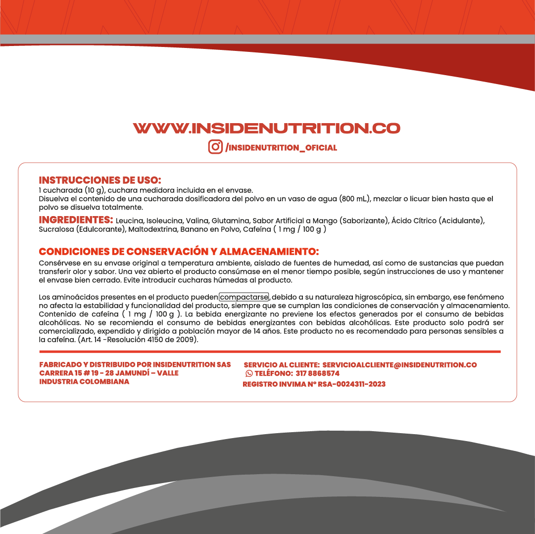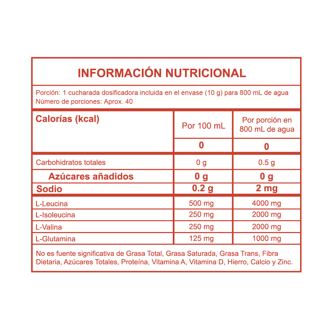 Alimento que contiene fruta deshidratada en polvo, aminoácidos ( Leucina, Isoleucina, Valina y Glutamina), entre otros ingredientes.