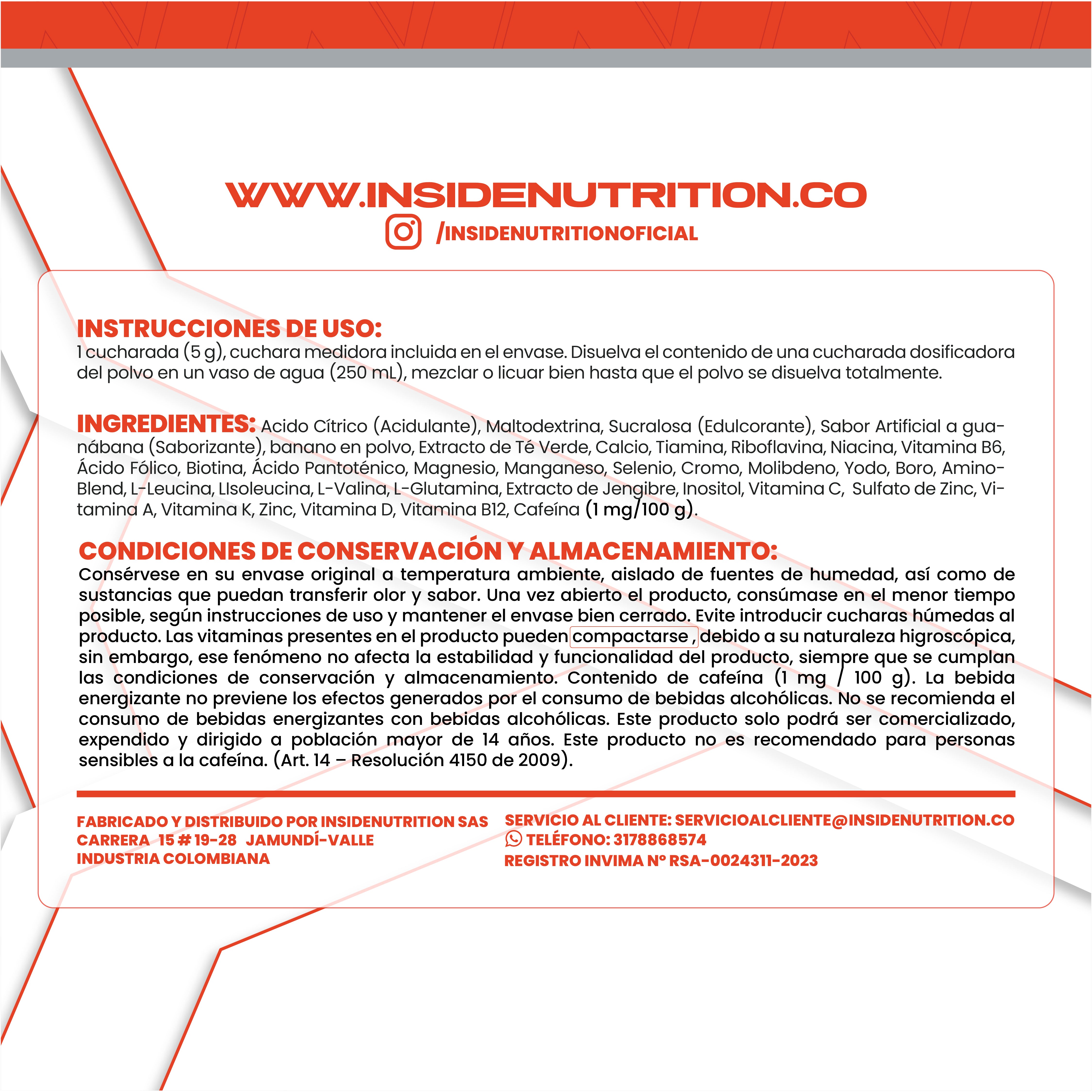 Contenido de cafeína (1 mg / 100 g). La bebida energizante no previene los efectos generados por el consumo de bebidas alcohólicas. No se recomienda el consumo de bebidas energizantes con bebidas alcohólicas. Este producto solo podrá ser comercializado, expendido y dirigido a población mayor de 14 años. Este producto no es recomendado para personas sensibles a la cafeína. (Art. 14 – Resolución 4150 de 2009).