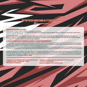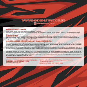 Alimento que contiene isomaltulosa, dextrosa, taurina, cafeína, aminoácidos (Beta alanina, citrulina, glutamina, arginina, citrato de magnesio, betaína HCL, histidina, taurina , teanina, cafeína ,tirosina), entre otros ingredientes.